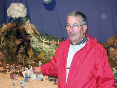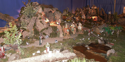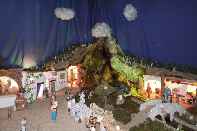 Es mucho el tiempo que los Paco dedica hasta poner a punto la escena, primero en casa preparando los “inventos” y luego en los meses previos a la Navidad en la Iglesia montándolos hasta quedar perfecto.